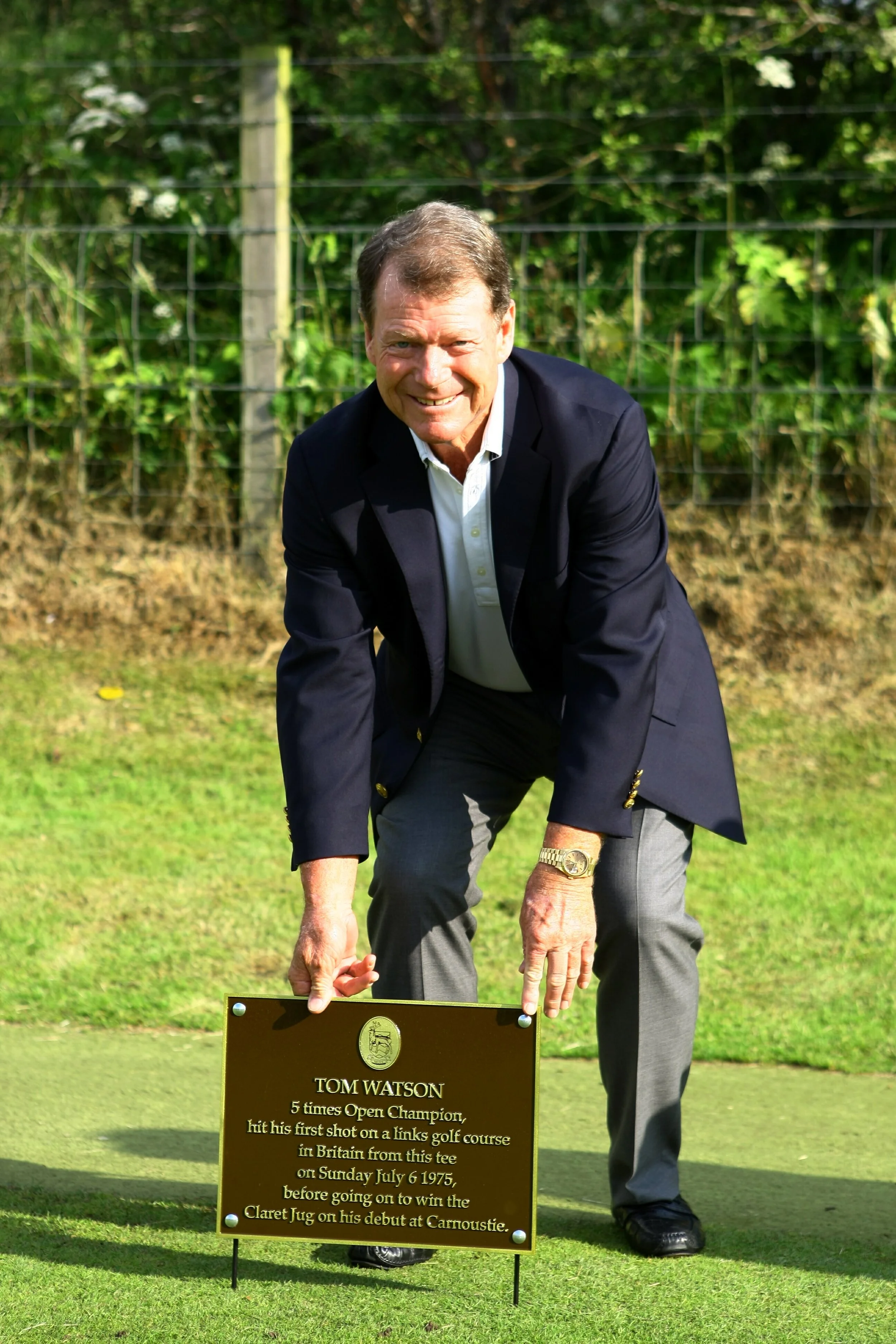 The Monifieth Links Chairman, helped the five-time Open Champion to embed a special plaque in the first tee to commemorate that less than auspicious tee shot from 1975.